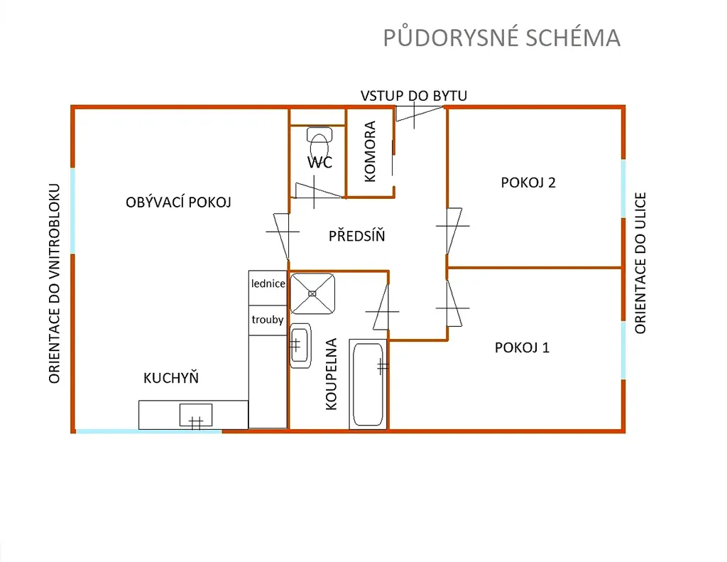 Dispozice bytu: z chodby domu se vstupuje do předsíně, ze které je vstup do všech místností-viz půdorys. Obývací pokoj o výměře cca 30m2 s volně propojenou kuchyňskou částí je obdélníkový a orientovaný do klidného vnitrobloku.