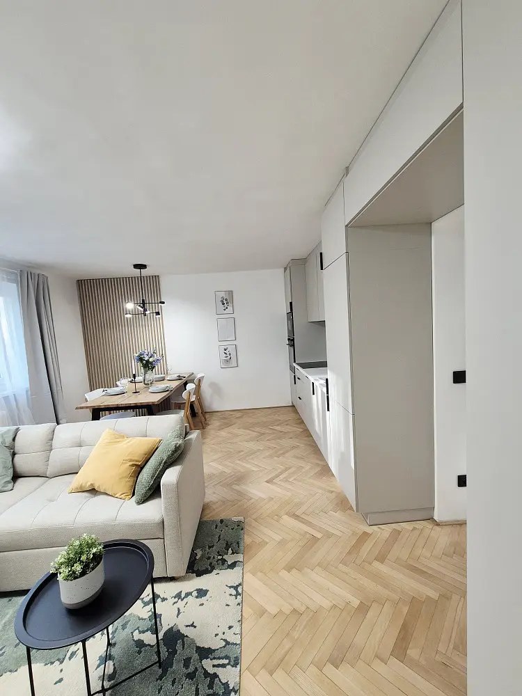 ​Interiér, ve kterém dosud nikdo nebydlel, prošel precizní kompletní rekonstrukcí podle návrhu architektky, která optimalizovala dispozici a kladla důraz na každý detail a dostatek úložných prostor. Eleganci obývacího pokoje a hlavní ložnice podtrhují renovované vlysové bukové podlahy, zatímco ve zbytku bytu je položena vysoce kvalitní německá laminátová podlaha Meister. Součástí prodeje je nová kuchyňská linka na míru vybavená značkovými spotřebiči v plné záruce (lednice Lord se zárukou 5 let, ostatní spotřebiče Kluge 4 roky) včetně myčky, horkovzdušné trouby, sklokeramické desky a granitového dřezu. Komfort doplňuje nová koupelna se sprchovým koutem a závěsným WC.