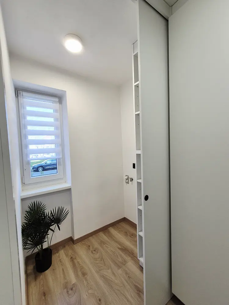 ​Praktickou stránku bytu zajišťuje velkorysé množství úložných prostor v podobě vestavěného nábytku na míru v chodbě, ložnici i obývacím pokoji a také samostatná šatna s přípravou pro pračku a sušičku. V rámci rekonstrukce byly realizovány nové štukové omítky, kompletní elektroinstalace v mědi, nové rozvody vody a odpadů, které jsou v kuchyni řešeny špičkovou a tichou přečerpávací stanicí Grundfos. Dále byly osazeny bezpečnostní vchodové dveře (třída RC3), interiérové dveře s obložkami spolu s úsporným LED osvětlením. Vytápění a ohřev vody jsou řešeny dálkově.