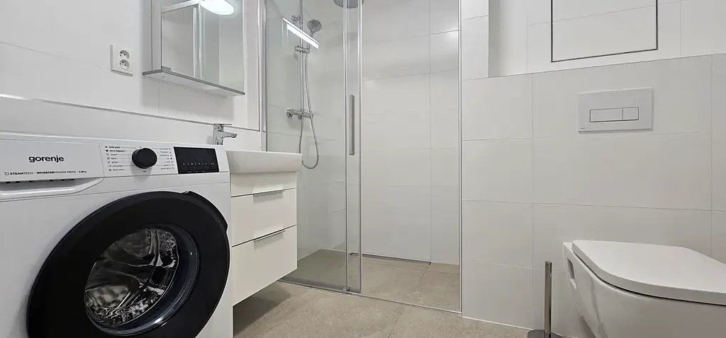 Koupelna: sprchový kout, umyvadlo se skříňkou, zrcadlo, pračka, WC.