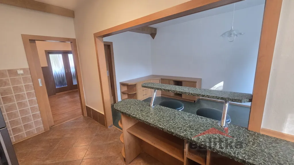 Z prostorné vstupní haly, kde jsou velké vestavěné skříně je vstup do 3 samostatných pokojů. Dále je zde kuchyň, která odděluje prostornou jídelnu. V kuchyni je zabudovaná elektrická trouba, mikrovlnka, plynová deska s digestoří, myčka, volně stojící lednice s mrazákem a spoustu úložného prostoru. Koupelna včetně wc prošla kompletní, moderní rekonstrukcí. V koupelně je sprchový kout, umyvadlová sestava a napojení na pračku. Wc je zvlášť. Vedle koupelny je komora. Ze dvou pokojů je vstup na velkou terasu 15m2, která má nově zrekonstruovanou dřevěnou podlahu. Oba pokoje jsou situované do klidné části plné zeleně. V ceně nájmu je zahrnuto 1 parkovací stání ve dvojgaráži. Dále je zde velký zděný sklep 12m2 s uzamykatelnými vchodovými dveřmi.