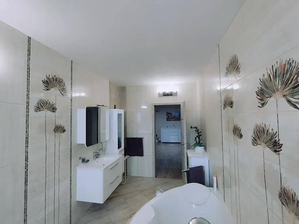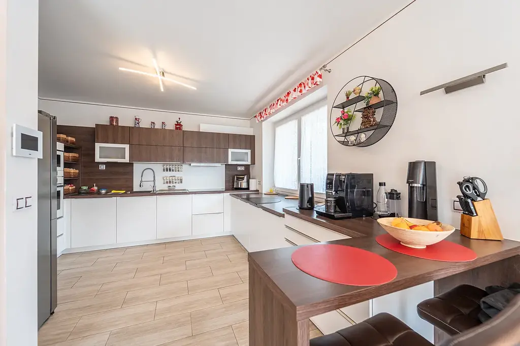 Nabízíme prodej moderního samostatného rodinného domu v lukrativní lokalitě obec Chýně Praha západ. Prostorný a světlý dům s obytnou plochou 220m2 a dispozicí 4+kk, garáží, velkou zahradou a bazénem je zárukou komfortu pro rodinné bydlení v klidné části obce. Zastavěná plocha a nádvoří je 340m2, zahrada kolem domu 964m2, příjezdová cesta/zahrada 89m2.