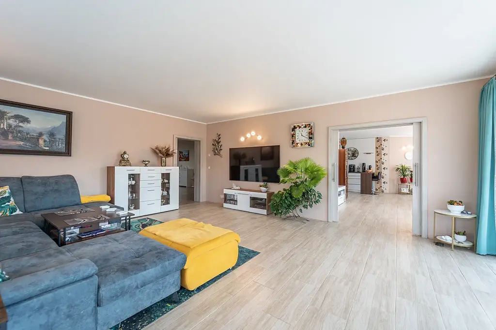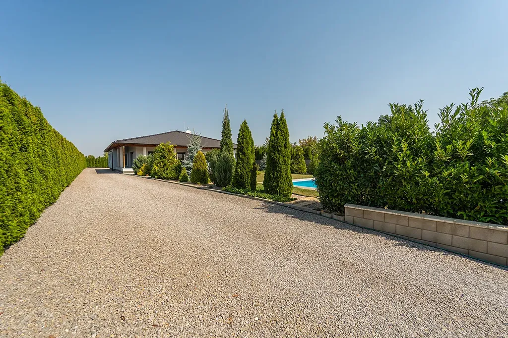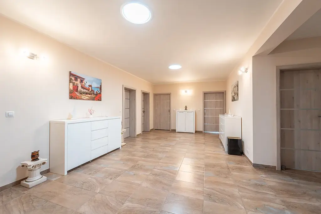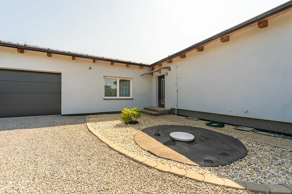 Dům je cihlový (Porotherm) a zateplený (40+10). V domě se nachází prostorná hala se světlovody, které do domu přivádí denní světlo zvenku. Dále pak dispozici tvoří kuchyně s velkým jídelním prostorem, obývací pokoj s velkoformátovými okny, ze kterého je přímý vstup na terasu a zahradu se zapuštěným nevytápěným bazénem 1,5x3x5m. Dům disponuje třemi neprůchozími pokoji, praktickou šatnou a dvěma koupelnami. Jedna koupelna je s vanou a druhá se sprchovým koutem a vstupem na menší terasu s posezením a orientací na východ. Na halu navazuje chodbička do další místnosti, kterou lze využít jako obývací místnost nebo pracovnu, a do technické místnosti, kde se nachází tepelné čerpadlo, zásobník teplé vody, pračka, sušička apod., dále je zde vstup do garáže. V zadní části domu se nachází hlavní vstup do domu a chodbička, ze které vede výsuvný žebřík na pochozí půdu. Dům má okna-trojskla (AR Okenní technika). K domu náleží garáž pro dvě auta.