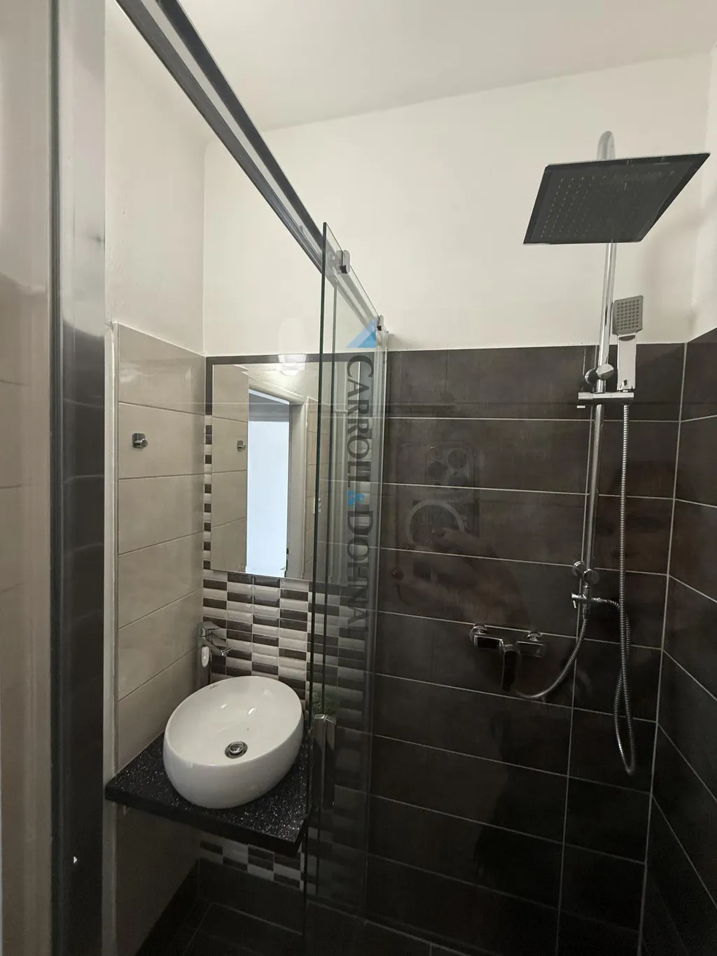 Koupelna se sprchovým koutem je elegantní, nabízí i prostor pro pračku.