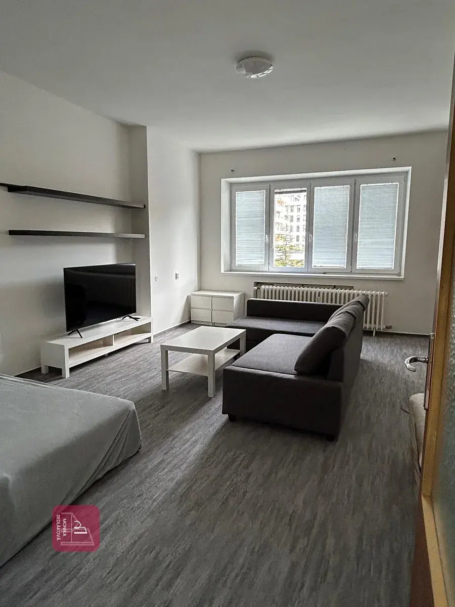 Dispozice bytu je prakticky řešena. Ze vstupní chodby s kuchyňskou linkou, můžete dále vstoupit do prostorného obývacího pokoje nebo do koupelny se samostatným WC. Byt se nabízí jako částečně vybavený. K dispozici je lednice, mikrovlnná trouba, pračka a varná deska.