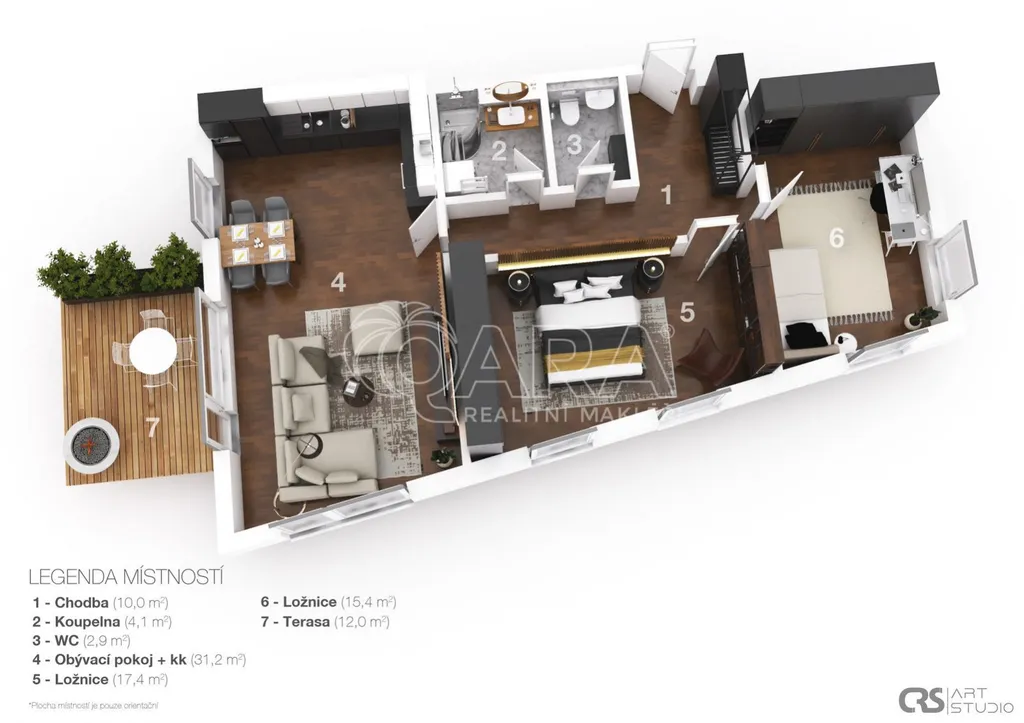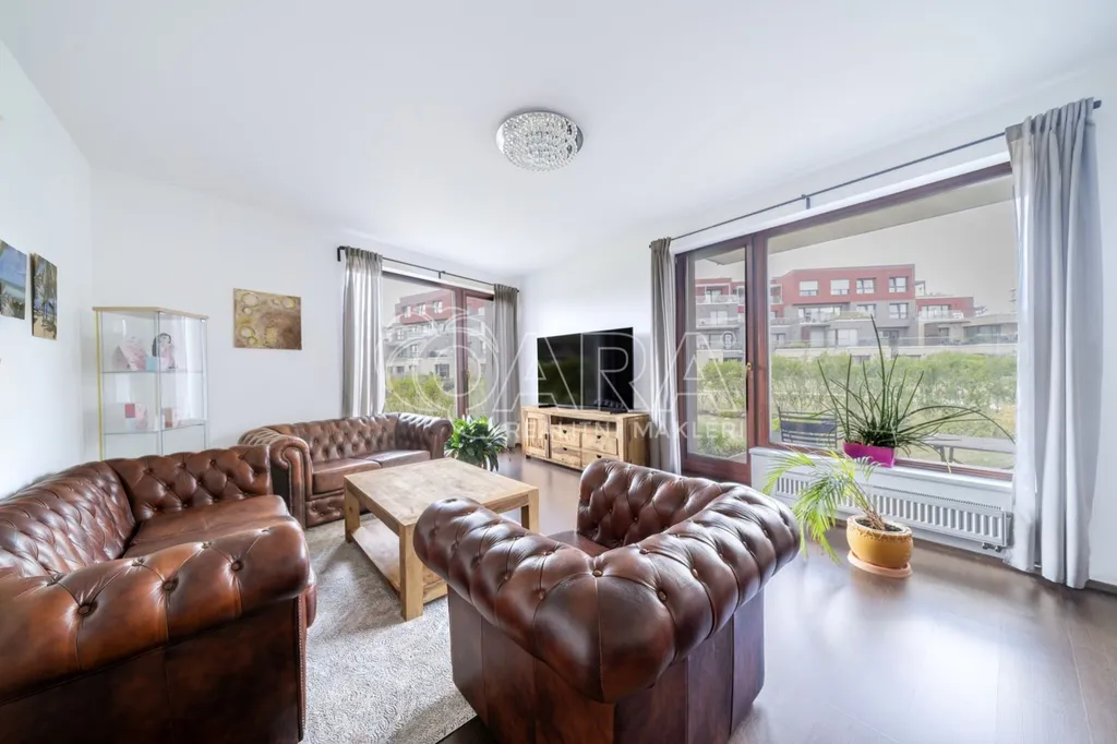 Byt, kolaudovaný v roce 2014, má dispozici 3+kk a je opravdu prostorný předsíň má 10 m2, ložnice 17,4 a 15,4 m2, obývák s budoucím kuchyňským koutem 31,2 m2, koupelna 4,1 m2 a WC s pračkou 2,9 m2. Dále k bytu patří velký sklep 5,5 m2 a výjimečně i předzahrádka 90 m2, jejíž součástí je terasa o ploše cca 12 m2. Obývací pokoj a předzahrádka jsou orientované na jihozápad, pokoje na severovýchod a jihovýchod. V areálu za závorou budete mít i vlastní parkovací stání.