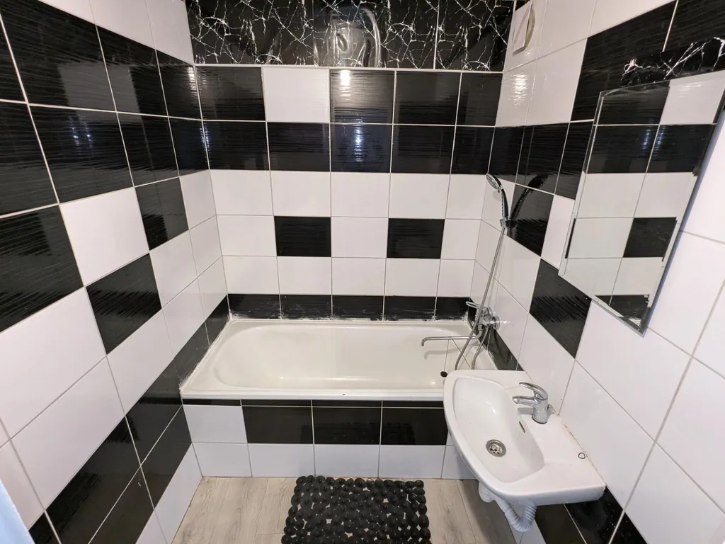 V kuchyni je momentálně kuchyňská linka s plynovými kamny, která bude pro nového nájemníka vyměněna za novou, prostor na pračku i myčku připraven. Koupelna obložena vkusnými obklady, je vybavena vanou a umyvadlem.