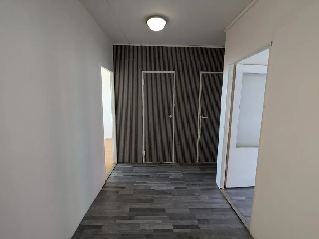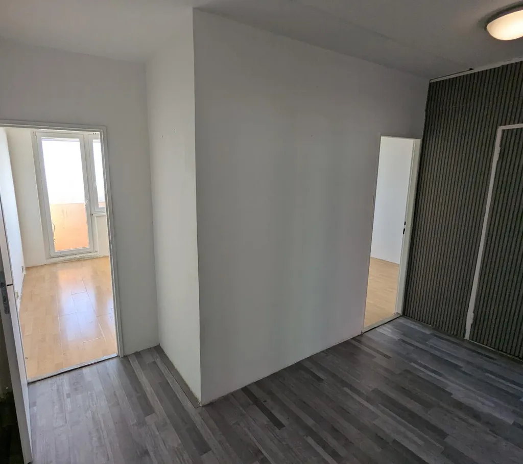 V bytě je kombinace plovoucích podlah a linolea. Místnosti jsou světlé a prostorné.
