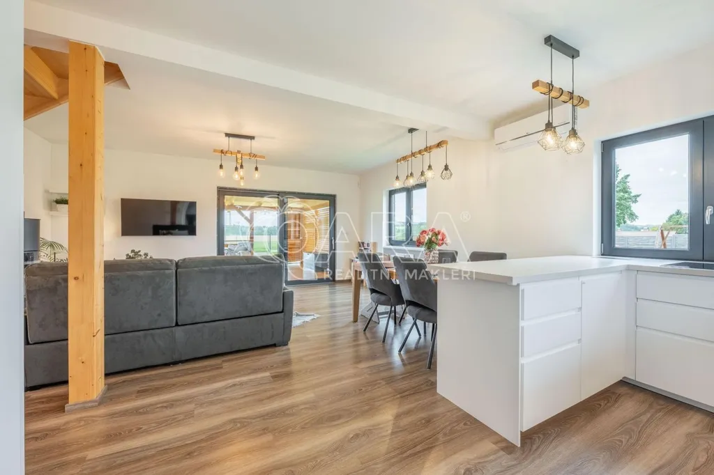 Dvoupodlažní rodinný dům o celkové ploše 136,9 m se rozkládá na pozemku o výměře 1851 m. Dům je dispozičně řešen jako 6+kk s přímo navazující terasou. Dům sestává z obývacího pokoje s kuchyňským koutem, pěti pokojů, technické místnosti, spíže, chodby, koupelny se sprchovým koutem a WC v prvním patře a koupelny s vanou, sprchovým koutem a WC ve druhém patře. Z pozemku je krásný výhled na les.