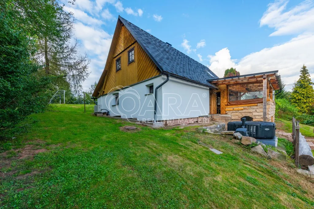 Dům je zděný, částečně roubený a nabízí dispozici 4+kk: