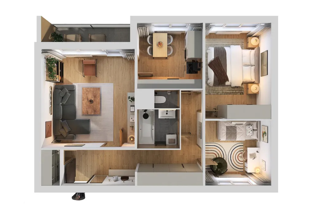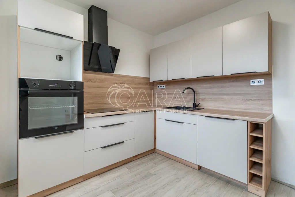 Dispozice bytu je chytře řešená, s vanou v koupelně a dostatečným prostorem pro pračku. Součástí bytu je nová kuchyňská linka, navržená pro každodenní provoz, vybavená indukční varnou deskou, vestavnou troubou a myčkou s prostorem pro lednici. Celé řešení je praktické, s dostatkem pracovních i úložných ploch, aby kuchyně přirozeně fungovala jako centrum domácnosti.