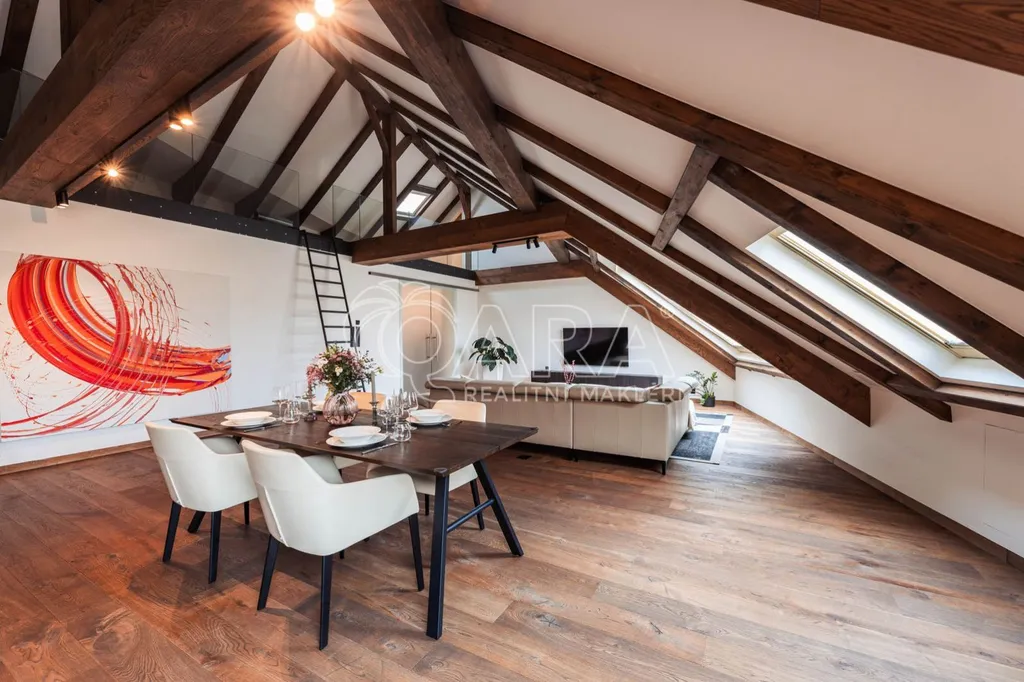 V celém bytě jsou dřevěné podlahy, vysoké stropy a nadstandardní množství vestavěných úložných prostor. Komfort zajišťuje stropní sálavé vytápění a chlazení, systém nucené výměny vzduchu, inteligentní ovládání domácnosti Loxone a vysokorychlostní optický internet.