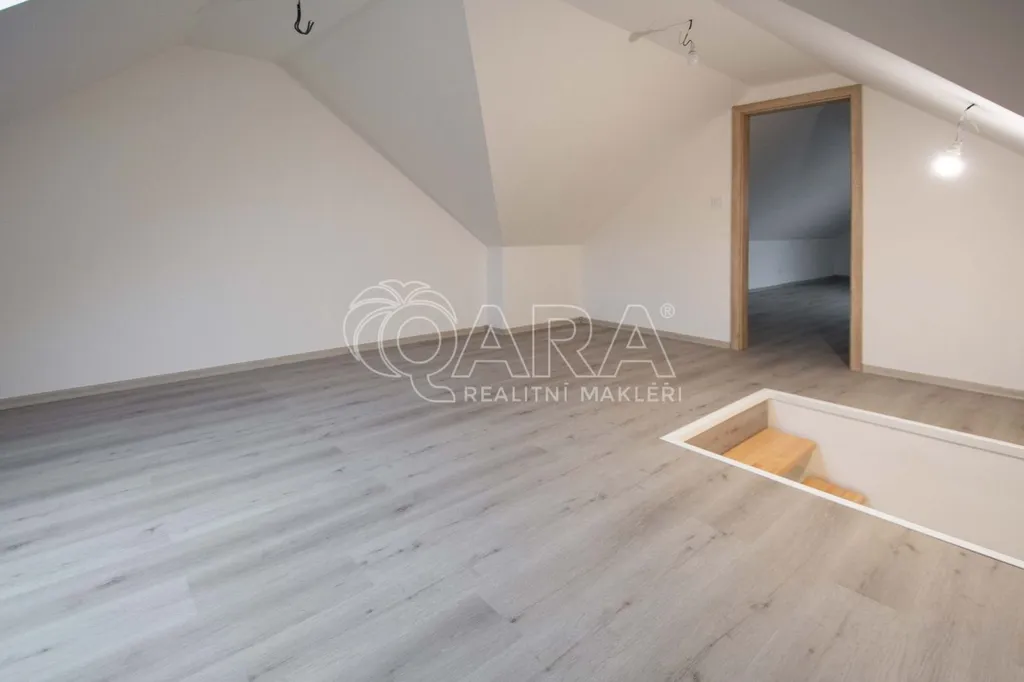 V přízemí vstupní chodba, prostorný obývací pokoj s kuchyňským koutem, koupelna s WC a samostatný pokoj, celková velikost 73,4 m2. V podkroví chodba a dvě samostatné ložnice o celkové velikosti 69,5 m2.