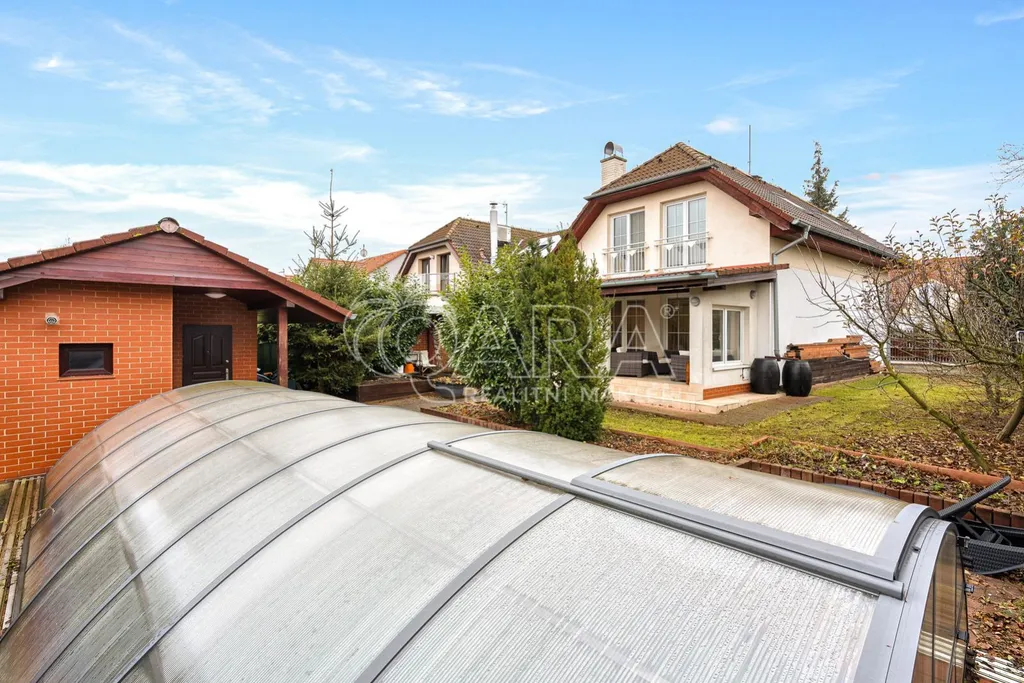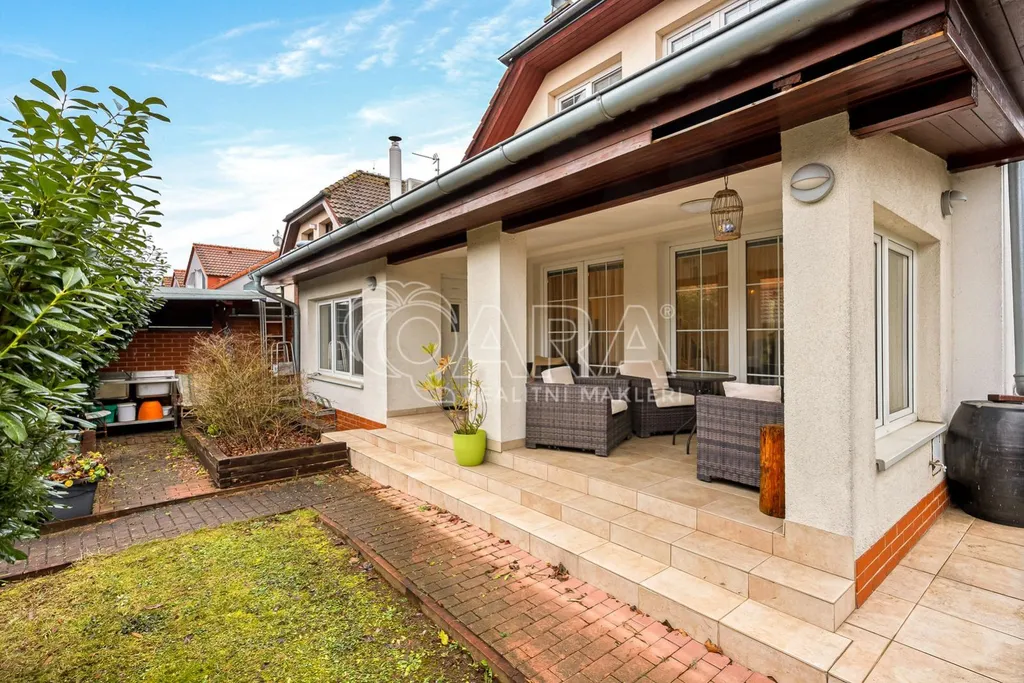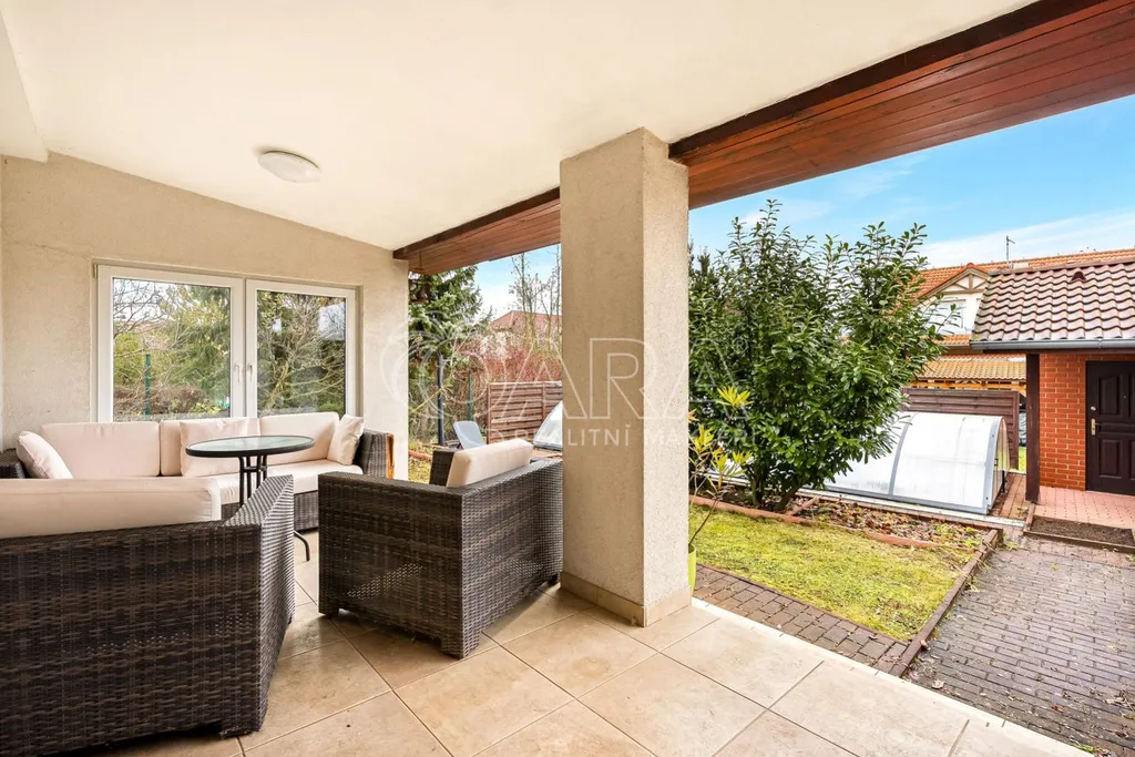 Představte si, že ráno vyjdete na terasu. I když venku prší, je vám tady pod střechou dobře. Jako byste měli druhý obývací pokoj venku na čerstvém vzduchu, s výhledem na upravenou zahradu a bazén. Ve vilové čtvrti v obci Hostivice u Prahy žijete svoji splněnou představu domova.