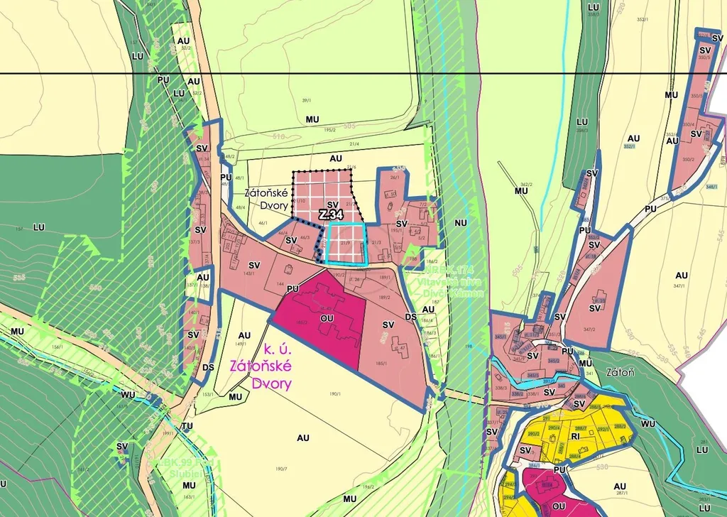 Dle Územního plánu jsou plochy zařazeny do kategorie: SMÍŠENÉ OBYTNÉ VENKOVSKÉ. To umožňuje stavbu rodinného domu i objektu pro rodinnou rekreaci. Maximální zastavitelnost je 30 %, limit podlaží 2 NP (případně 1 NP + podkroví) s možností podsklepení.