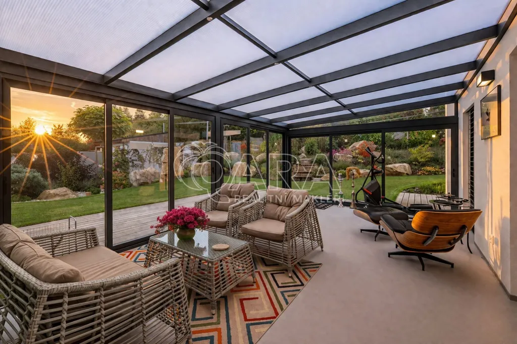 Celoroční využití (jídelna / relaxační zóna), podlahové vytápění, přímý vstup na zahradu, dálkově ovládané stínění ISOTRA