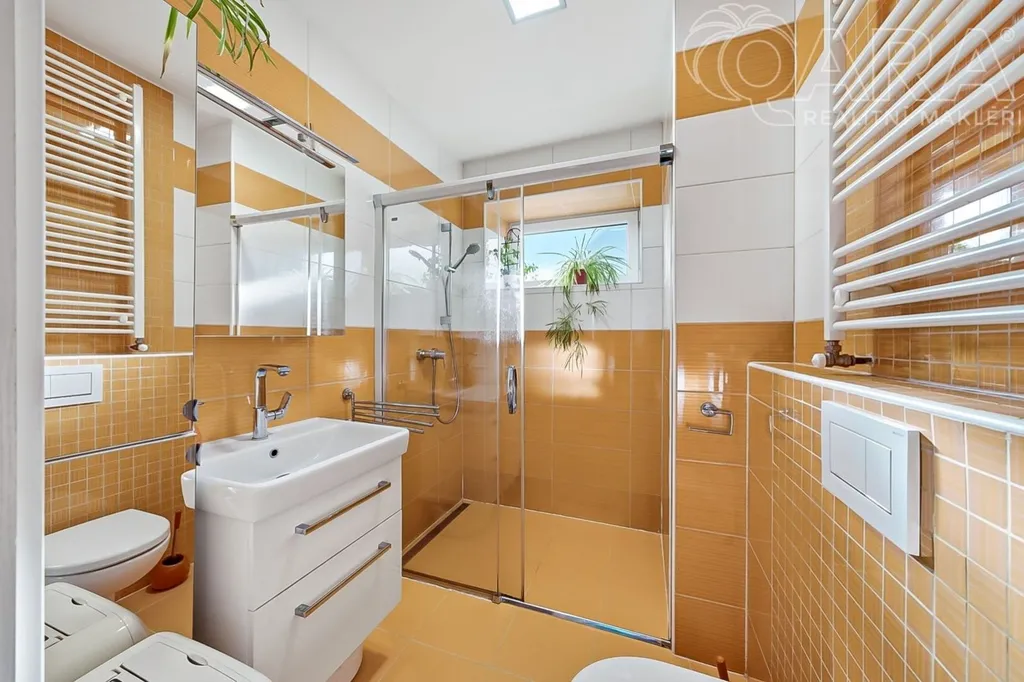 Vytápění: Plynový kotel + bojler. Velkým bonusem je příprava na tepelné čerpadlo (jednotka je již osazena venku, zbývá pouze dopojit do systému).