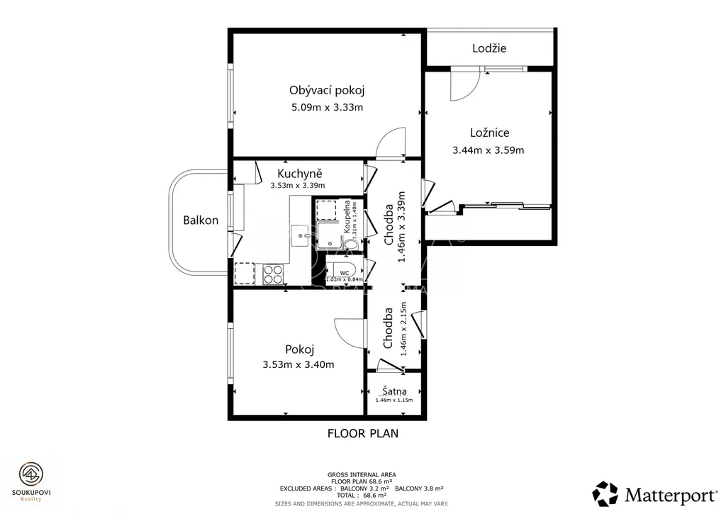 Byt nabízí tři neprůchozí pokoje, samostatnou kuchyň, koupelnu, WC, šatnu, balkon i lodžii. Nedávno byly položeny vinylové podlahy v obývacím pokoji a předsíni, a v ložnici i předsíni jsou na míru vyhotovené vestavěné skříně, které maximálně využívají každý centimetr prostoru a jsou součástí prodeje. K bytu náleží sklepní kóje přímo v patře, což zajišťuje maximální pohodlí a úložné možnosti. Velkou výhodou tohoto bytu je jeho světlost a příjemná orientace na jihovýchod a severovýchod, díky které je v bytě dostatek denního světla po celý den.