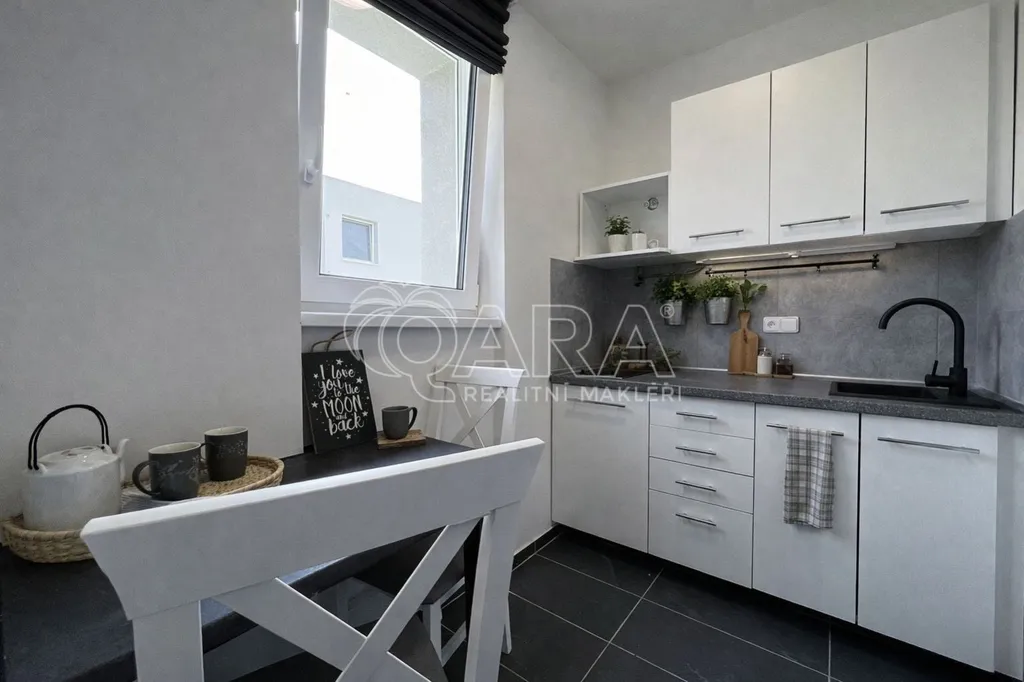 Byt je řešen maximálně účelně, aby každý metr měl své využití. Součástí je nová kuchyňská linka v bílé barvě s chromovými úchyty, granitovým dřezem a černou baterií značky Cooke and Lewis. Vybavení doplňuje dvouplotýnková sklokeramická deska Amica.