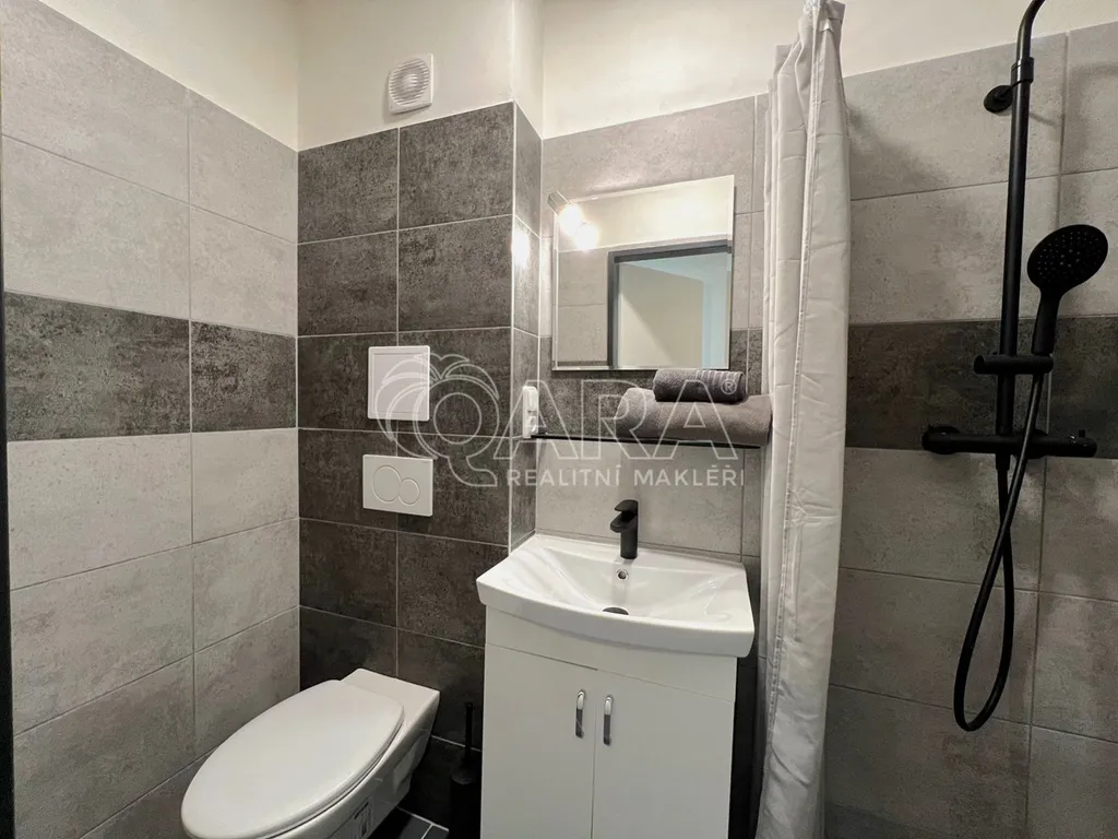 Koupelna nabízí moderní sprchový kout, závěsné WC Geberit a umyvadlo se skříňkou. Design je laděn do současných trendů antracitové obklady a dlažba v kombinaci se šedou laminátovou podlahou v obytné části.