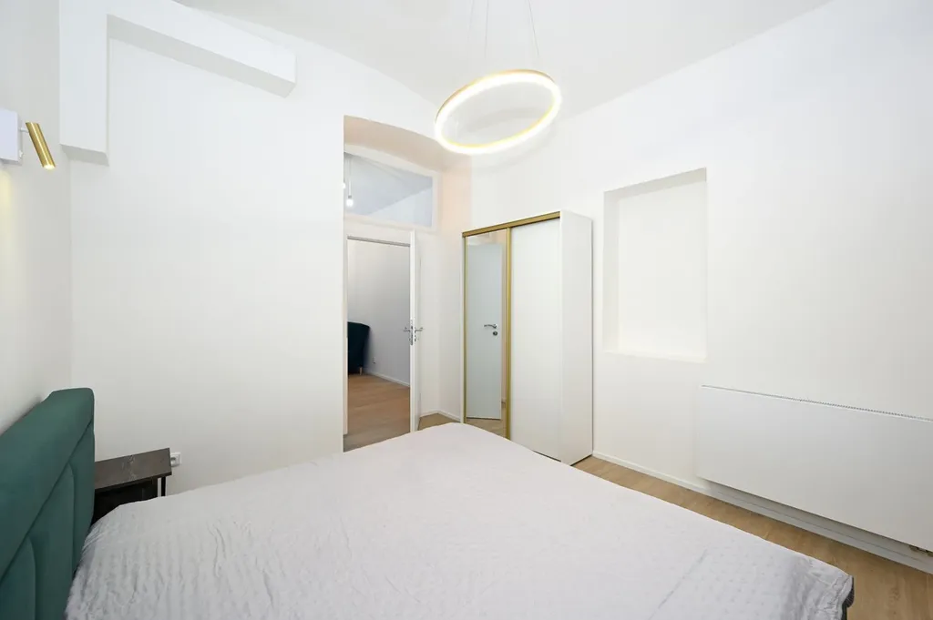 Dispozici tvoří obývací pokoj s kuchyňským koutem a barovým jídelním pultem, samostatná ložnice, koupelna se sprchovým koutem a vstupní chodba. Interiér působí velmi vzdušně, a to díky vysokým stropům, které dodávají bytu osobitý charakter. V předsíni je prostorná vestavná skříň, další šatní skříň se nachází v ložnici, takže o úložný prostor zde rozhodně není nouze.