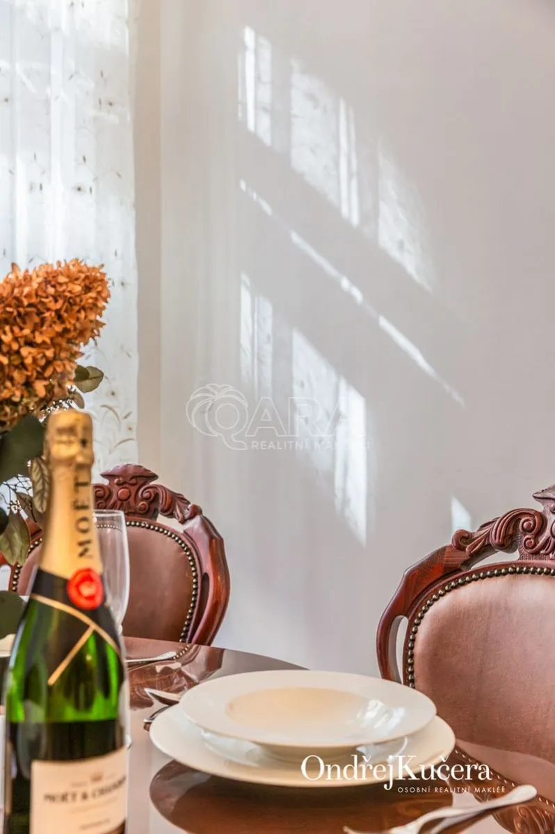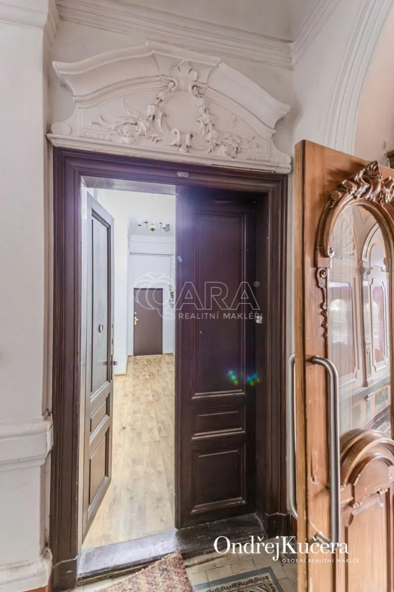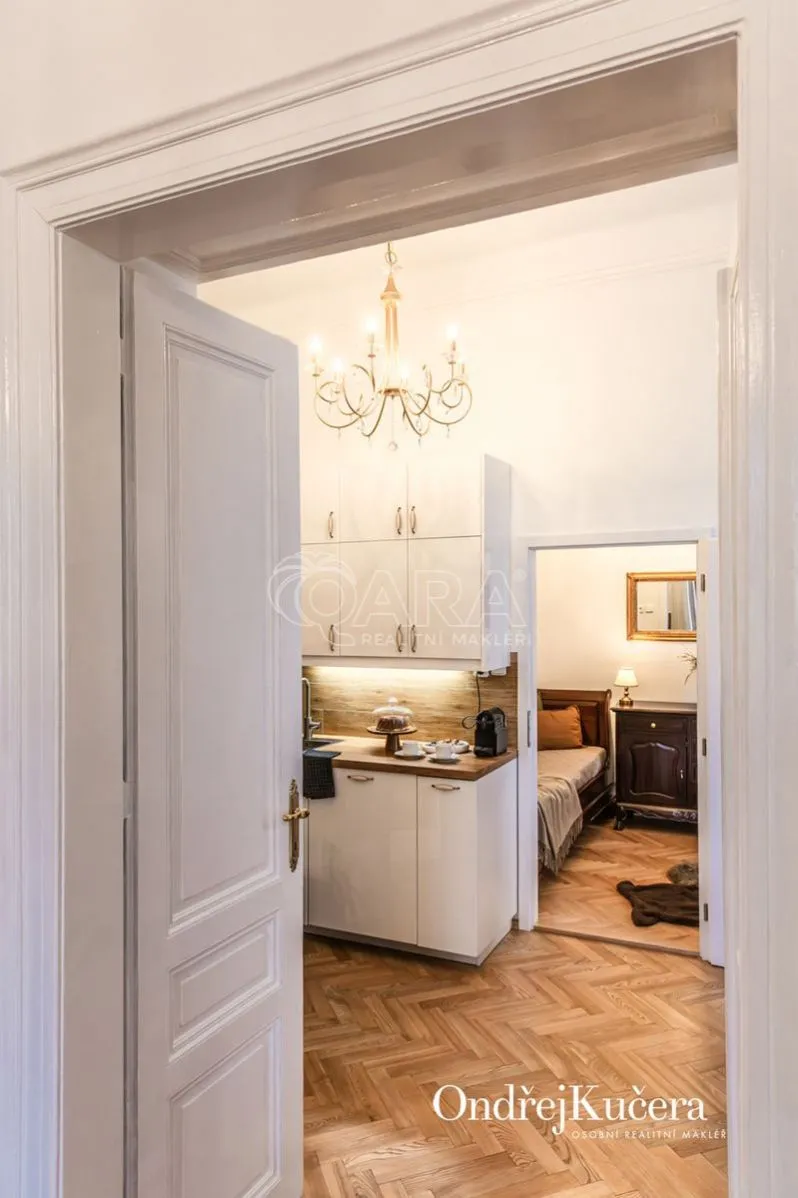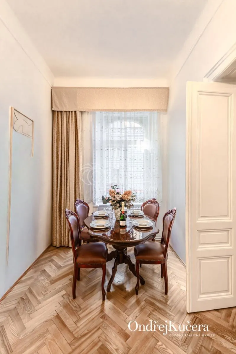 Součástí prodeje může být i kompletní vybavení včetně historického nábytku, což umožňuje okamžité užívání bez dalších investic. K bytu také náleží sklep o velikosti cca 2,5 m a společná chodba pouze pro dva byty.