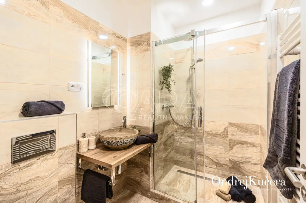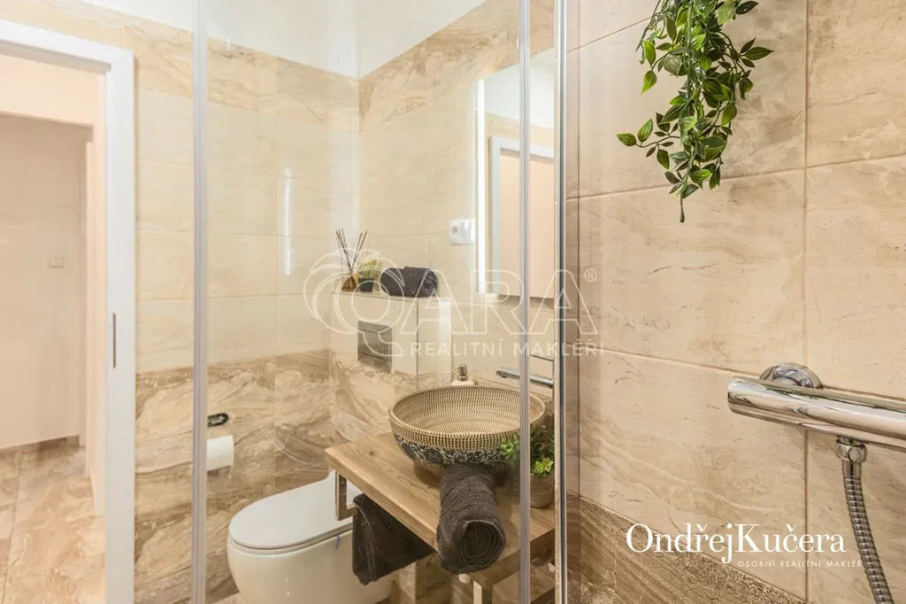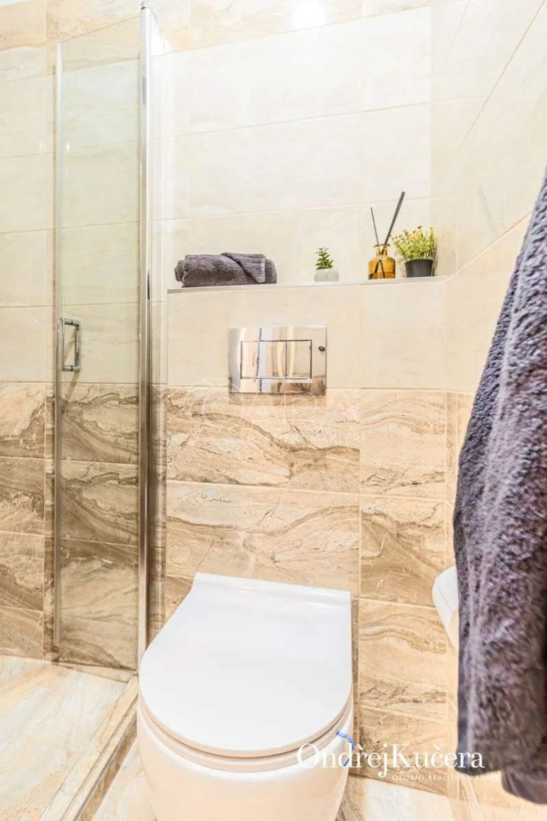 Dispozice zahrnuje dva samostatné pokoje, plně vybavenou kuchyň s jídelnou a dvě koupelny, každá se sprchovým koutem a toaletou. Toto řešení poskytuje komfortní bydlení i flexibilitu pro další využití, včetně dlouhodobých i krátkodobých pronájmů.