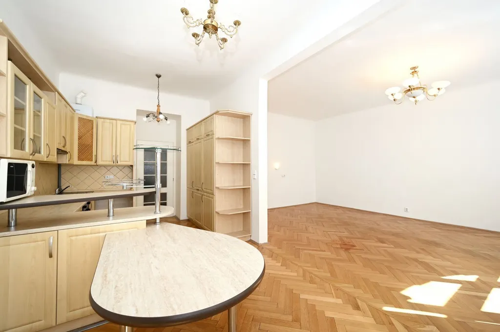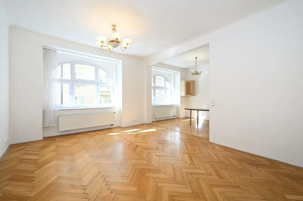 Samotný byt nabízí velkorysý obytný prostor s dostatkem místa pro obývací část i spaní. Díky velkým oknům a vysokým stropům je interiér velmi světlý a působí vzdušným dojmem. Na podlahách jsou dřevěné parkety, které podtrhují charakter celého bytu.