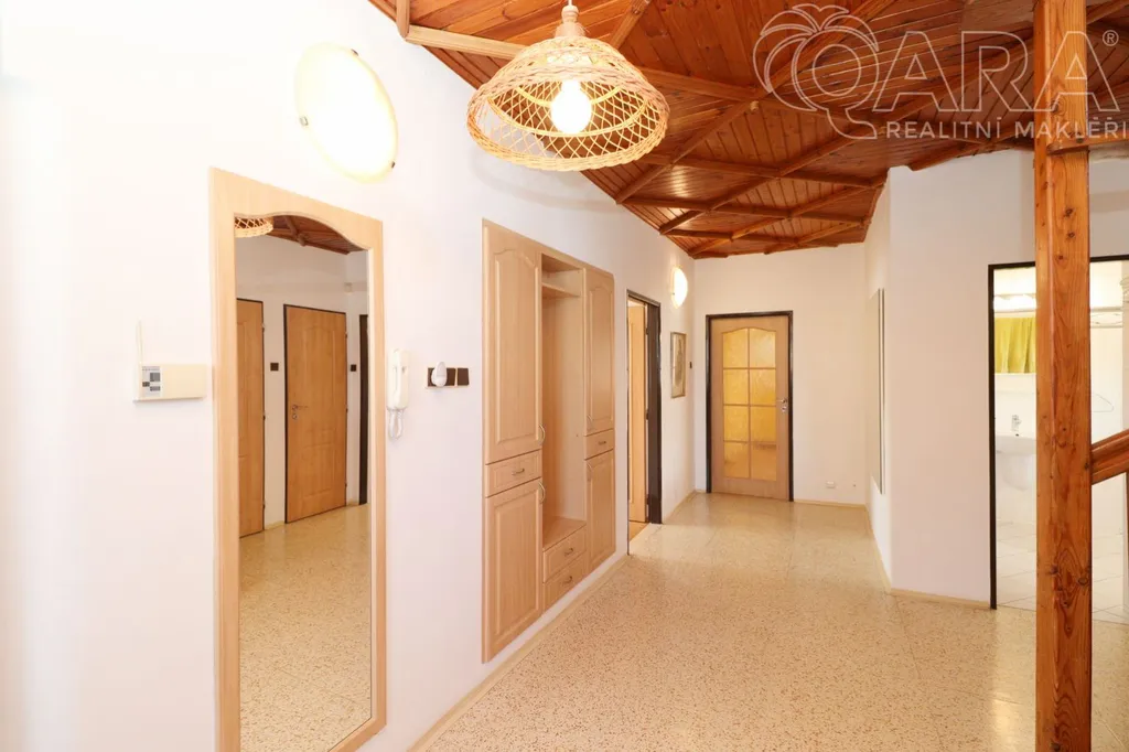 V suterénu domu se nachází prostorná garáž pro dvě auta (40 m) spolu s technickým zázemím, sklepem, skladem a prádelnou. Přízemí tvoří světlý obývací pokoj propojený s plně vybavenou kuchyní o celkové ploše 42 m, dále pokoj vhodný jako pracovna či pokoj pro hosty, vstupní hala, samostatná toaleta a praktická spíž. V patře je k dispozici hala se vstupem do tří ložnic, druhý obývací pokoj, koupelna s toaletou a šatna.