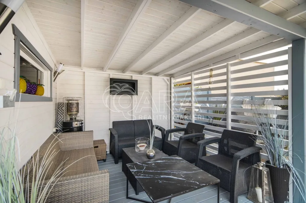 Druhou část domu o dispozici 3+kk tvoří obývací pokoj s kuchyňským koutem (cca 32 m2) a koupelnou s rohovou vanou a toaletou (cca 6 m2) a předsíň se schodištěm. Druhé nadzemní podlaží sestává ze dvou pokojů (cca 15,5 m2 a cca 17,5 m2)a koupelny se sprchovým koutem a toaletou (cca 6,2 m2). Ze dvou pokojů je vstup na společný balkon. V obývacím pokoji s kuchyňským koutem zavedeno podlahové vytápění, v ostatních prostorech instalovány radiátory.