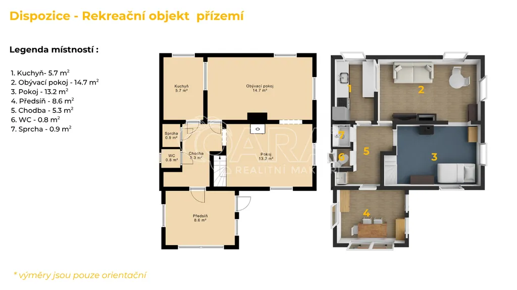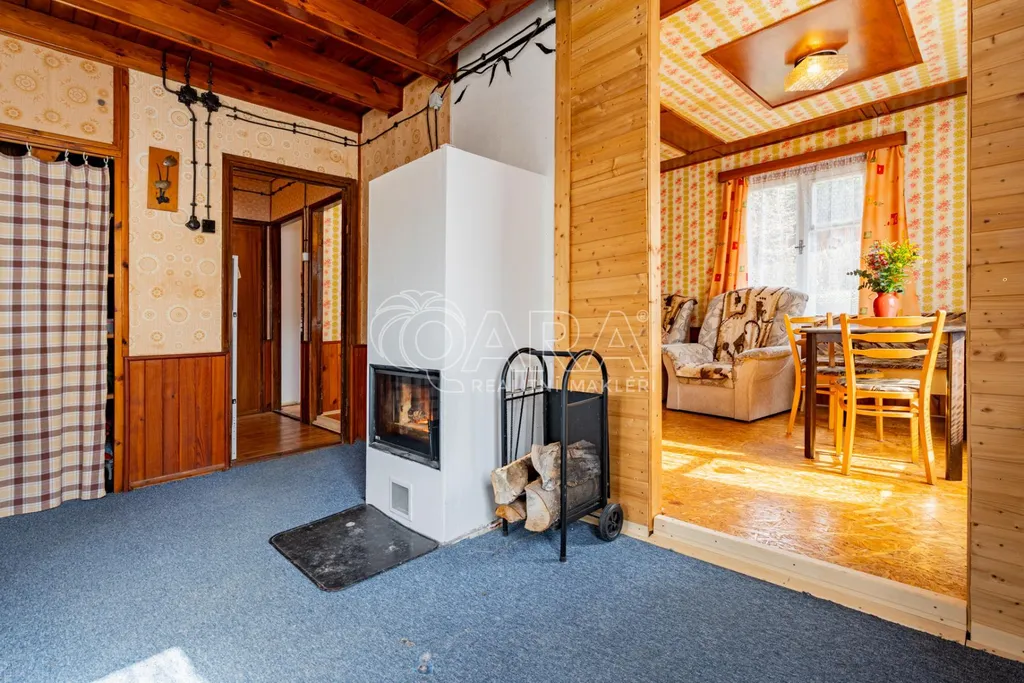 Přízemí: Veranda, chodba, koupelna (sprchový kout), umyvadlo, samostatná toaleta. Dále kuchyně, obývací pokoj a další pokoj osazený krbovými kamny na dřevo, která svou kapacitou stačí na vytopení celé chaty v jarním a podzimním období.
