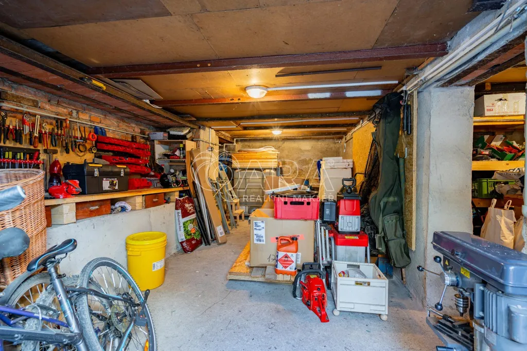 Suterén: Prostorná garáž s dílnou/sklepem a úložným prostorem.
