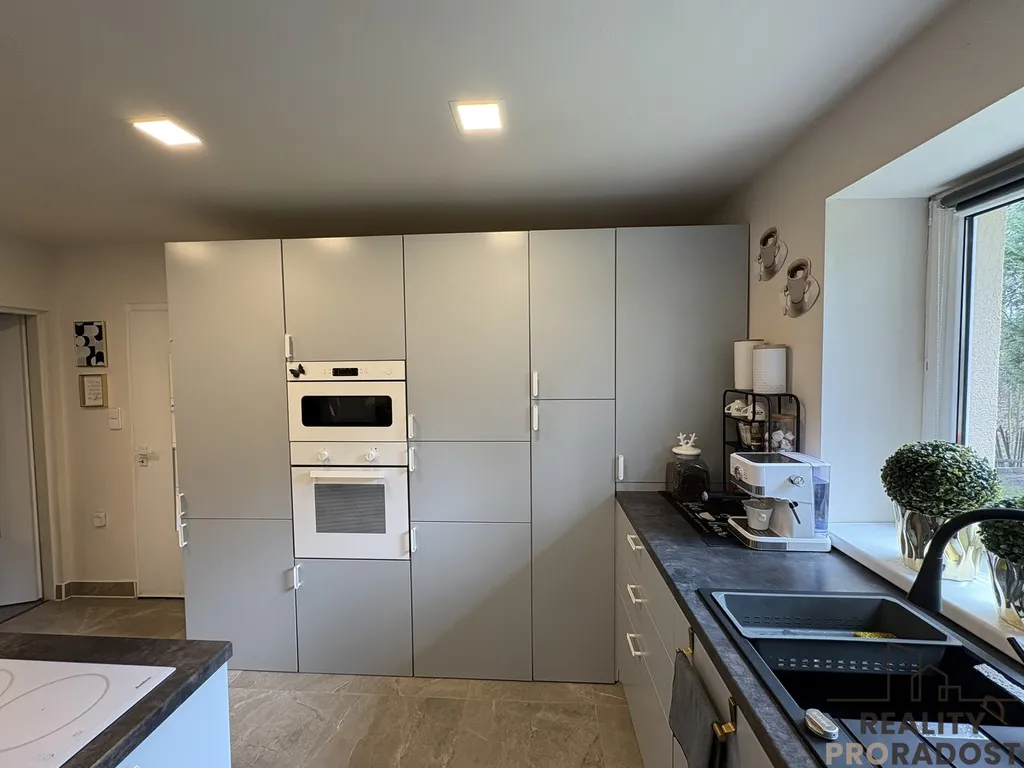 Interiér a vnitřní prostory nabízejí moderní design a vysoký standard vybavení. Srdcem domu je prostorná kuchyně s ostrovním pracovištěm, indukční deskou a vestavnými spotřebiči, jako myčka, trouba či digestoř.