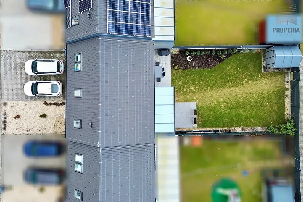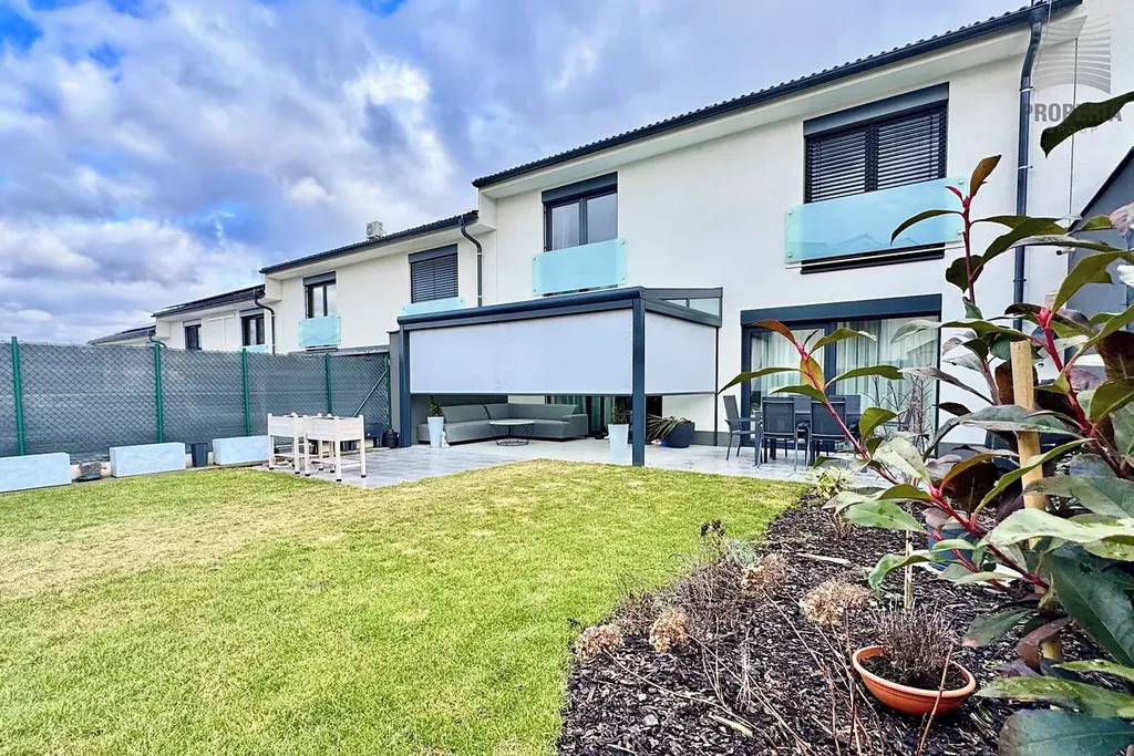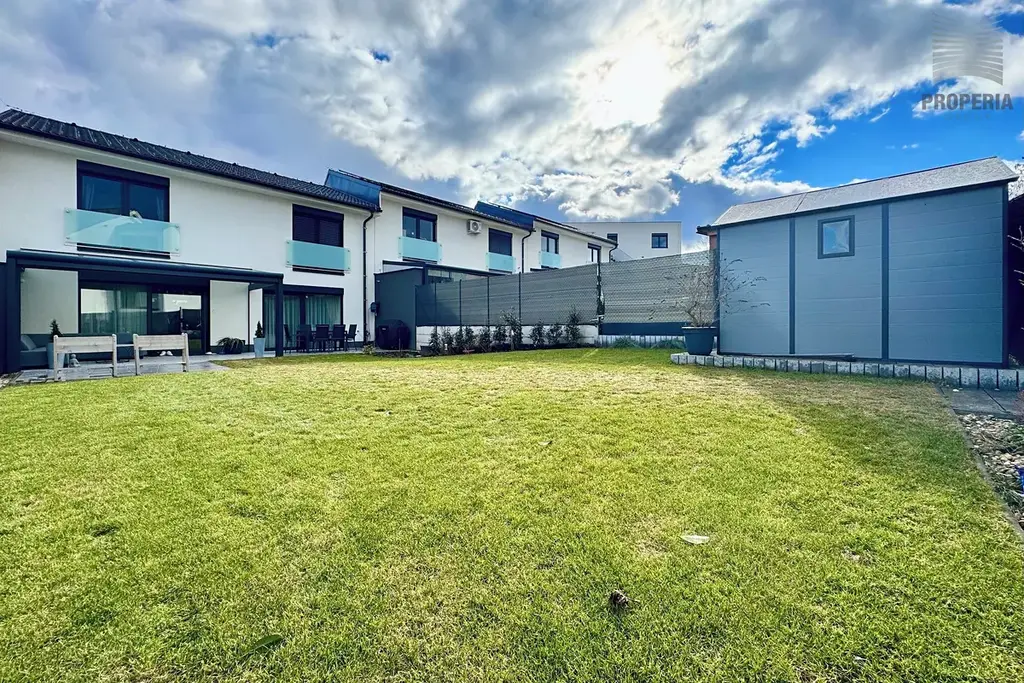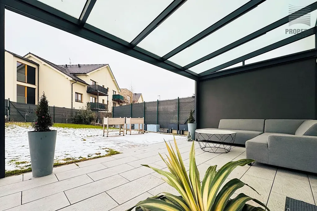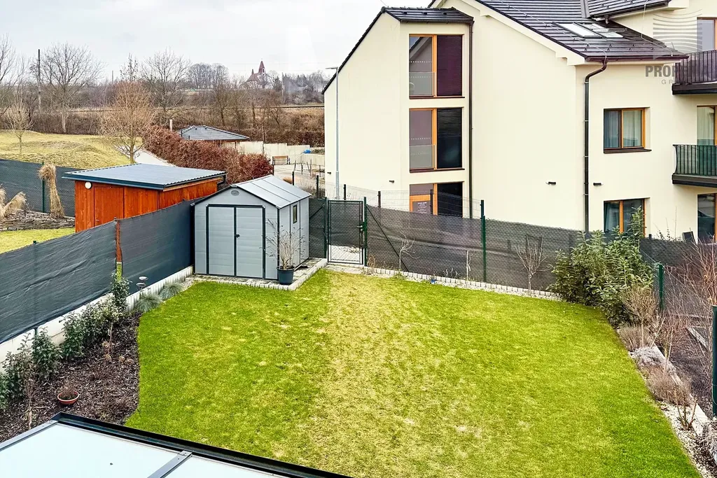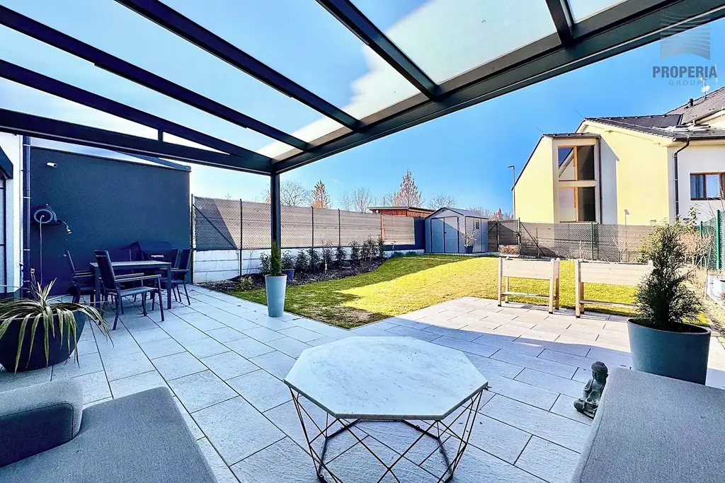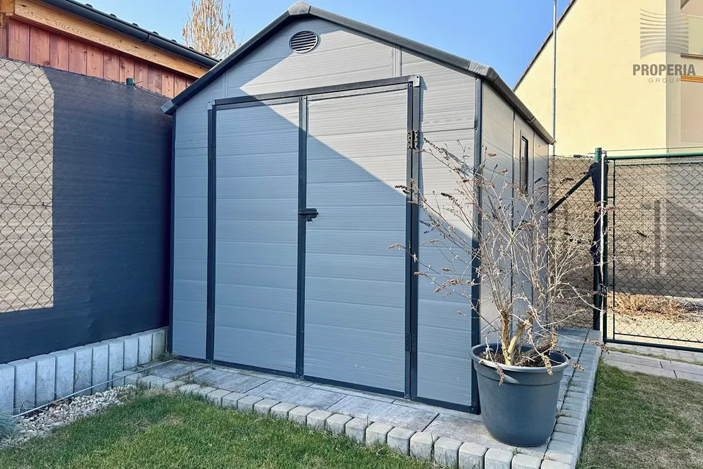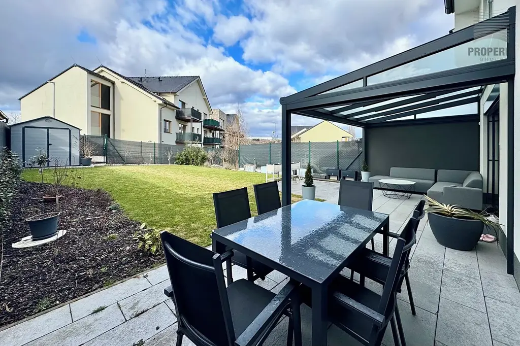 Přímo za domem naleznete sportoviště, dětské hřiště, psí výběh i prostor pro procházky, které jsou pohodlně dostupné ze zadního vstupu přes zahradu. Ta nabízí příjemnou klidovou zónu s hliníkovou pergolou vybavenou sreenovou roletou, venkovním posezením a praktickým zahradním domkem pro uskladnění nářadí. Trávník osazen automatickou závlahou napojenou na retenční nádrž o velikosti 3,5 kubíků. Dále voda pro obsluhu zahrady vyvedena na terase. Okna s el. ovládanými venkovními žaluziemi. Parkování před domem pro 2- 3 auta