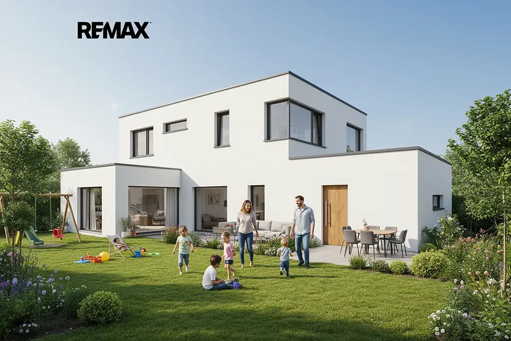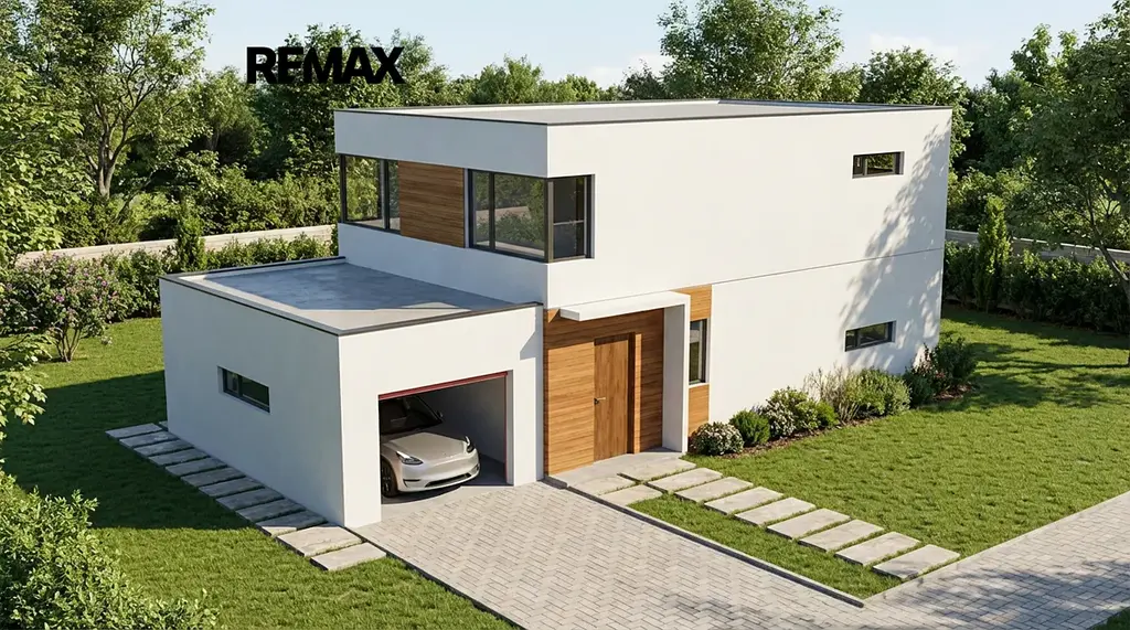 Moderní dvoupodlažní rodinný dům s garáží a rovnou střechou, situovaný v přední části pozemku.