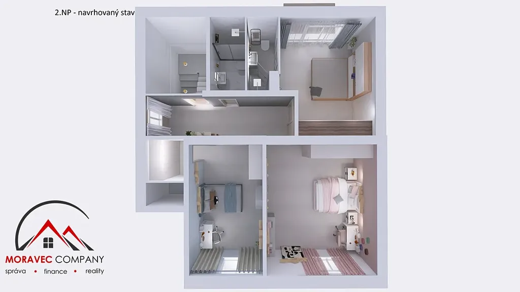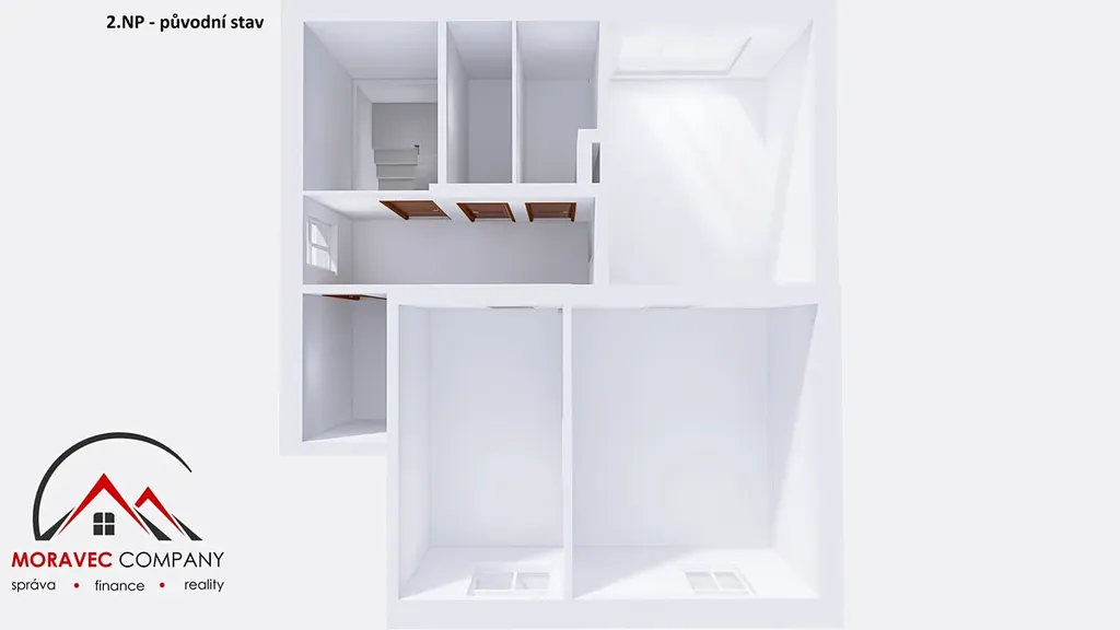 Dům má dvě nadzemní podlaží a díky dispozici nabízí možnost využití jako dvougenerační dům nebo přestavby na moderní jednogenerační bydlení s velkým otevřeným obytným prostorem v 1. NP a ložnicemi v patře. Pro Vaši jasnější představu jsme pro Vás připravili vizualizaci druhé varianty.