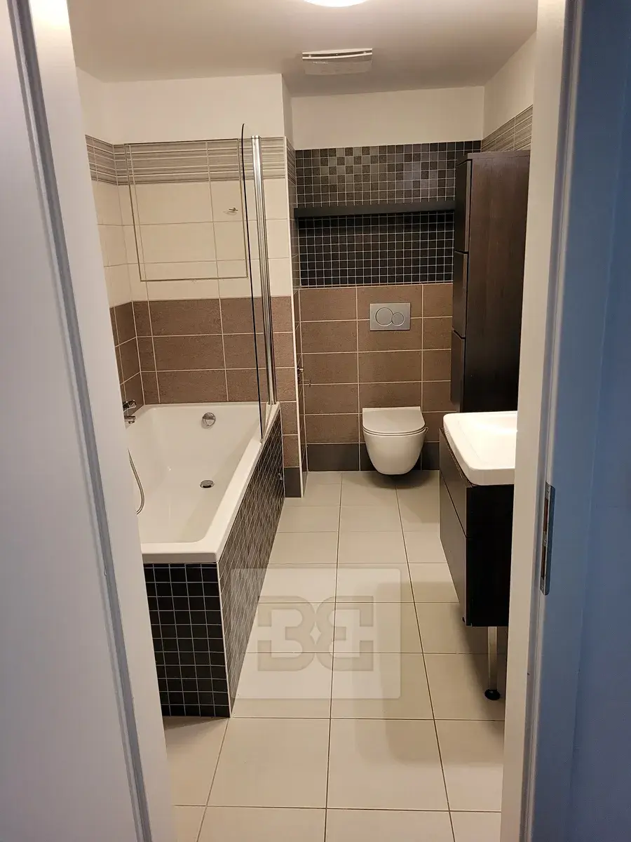 Koupelna je vybavena vanou, toaletou a podlahovým vytápěním.