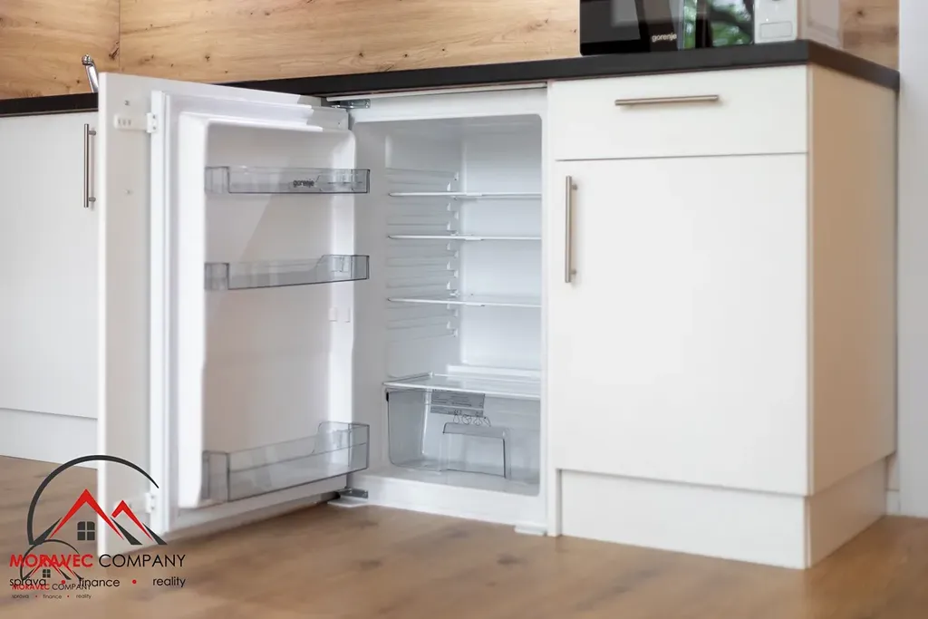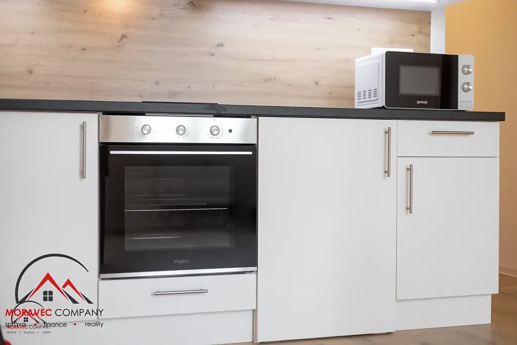 Vybavení bytu zahrnuje kuchyň s elektrickou troubou, indukční varnou deskou, digestoří, mikrovlnkou a zabudovanou lednicí. Koupelna je vybavena sprchovým koutem, pračkou a WC. Ohřev vody zajišťuje elektrický bojler.