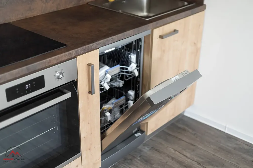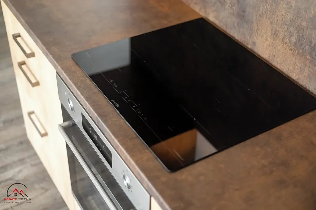Vybavení bytu zahrnuje kuchyň s elektrickou troubou, indukční varnou deskou, digestoří a zabudovanou myčkou. Koupelna je vybavena sprchovým koutem a WC. Ohřev vody zajišťuje elektrický bojler.