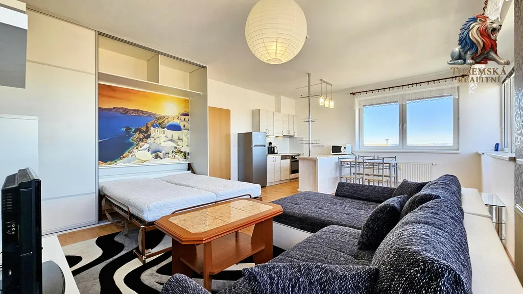 Ačkoli je byt 1+kk jeho pokoj je nadstandardně veliký a vejde se do něj vše, co ptřebujete. Kuchyňský kout, obývák a otevřením vestavěné skříně a sklopením velké postele přibude i ložnice. Uvnitř skříně se navíc objeví krásný obraz řeckého města Oia na ostrově Santorini, který Vás příjemně uvede do říše krásných snů o dovolené.