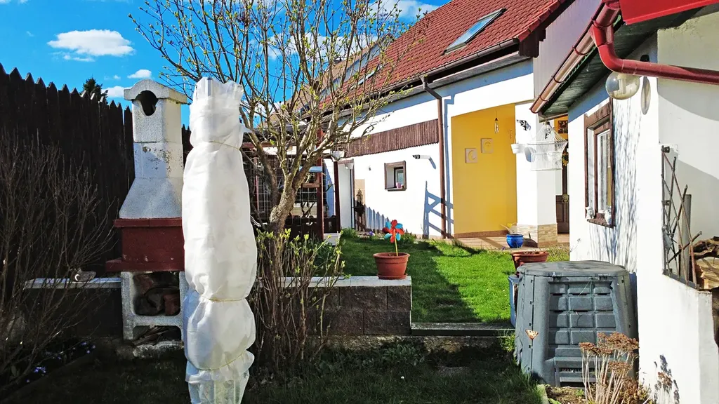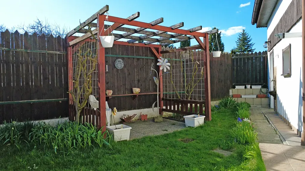 zahrada: posezení s pergolou, venkovní gril, sklad - komora, uzavřený dvůr - vysoký plot (úplné soukromí)