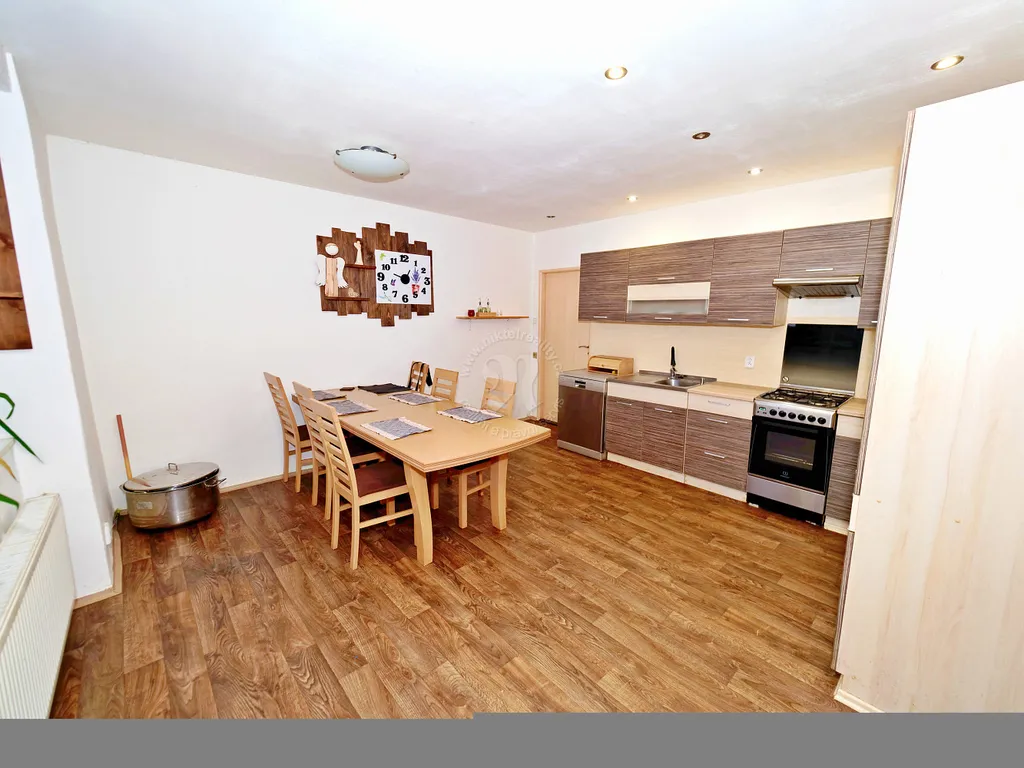 Dominantou interiéru je prostorná kuchyně (18 m²) s novější kuchyňskou linkou a s výhledem do vlastního uzavřeného dvorku, který poskytuje naprosté soukromí. Na kuchyň navazuje obytná část domu se světlým obývacím pokojem (17,5 m²) s instalovanými krbovými kamny, ložnicí (20 m²) a dětským pokojem (13 m²).