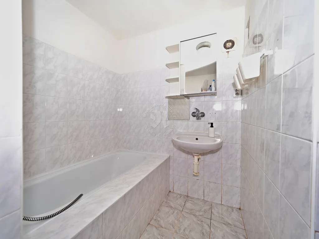 Velkoryse řešená koupelna nabízí vanu, umyvadlo, prostor pro pračku i sušičku a částečně oddělenou toaletu.
