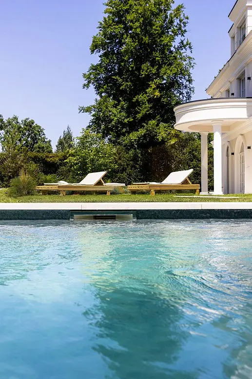 Na pozemku se nachází upravená zahrada s jihozápadní orientací, prostorné terasy, venkovní kuchyně a velký venkovní bazén o velikosti cca 100 m². Součástí domu je také plnohodnotná wellness zóna s hamamem, saunou a koupelnou se sprchou.