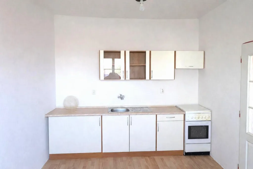 Byt disponuje samostatnou kuchyní, kde je k dispozici kuchyňská linka se dřezem a sporákem. Prostor kuchyně nabízí základní zázemí pro vaření. Obytná místnost je světlá díky oknům s dostatkem denního světla a působí vzdušně.