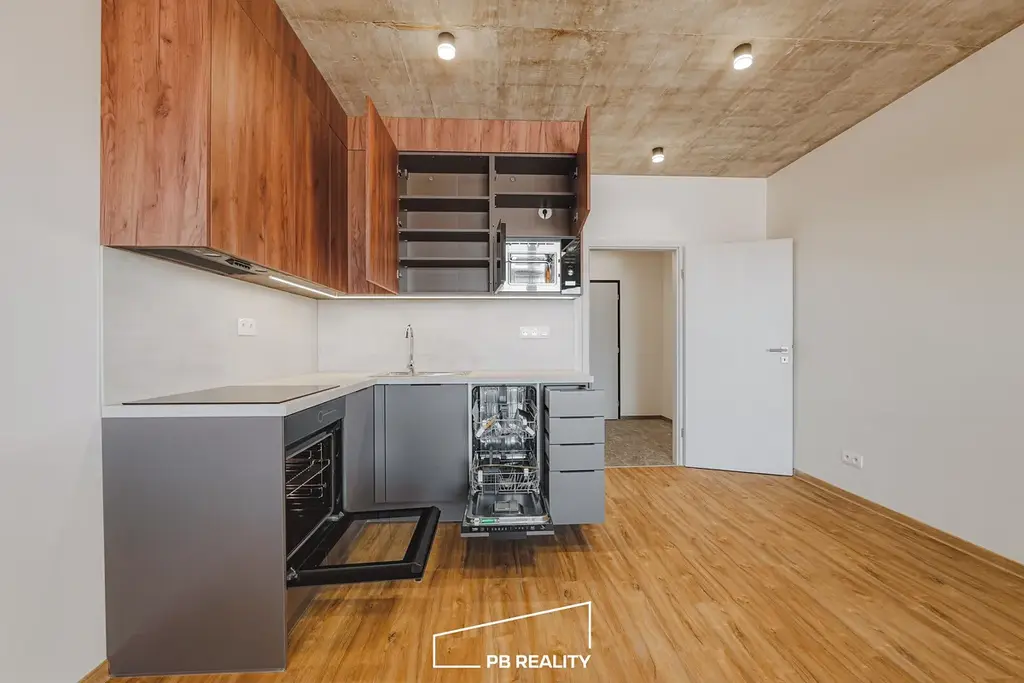 Bytová jednotka je vybavena kuchyňskou linkou včetně spotřebičů. Ostatní vybavení je ponecháno na novém nájemci – ideální příležitost vytvořit si domov podle vlastního vkusu.