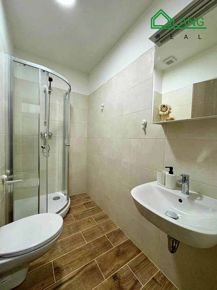 Moderní koupelna disponuje sprchovým koutem, umyvadlem se zrcadlem a toaletou, vše prakticky uspořádáno.