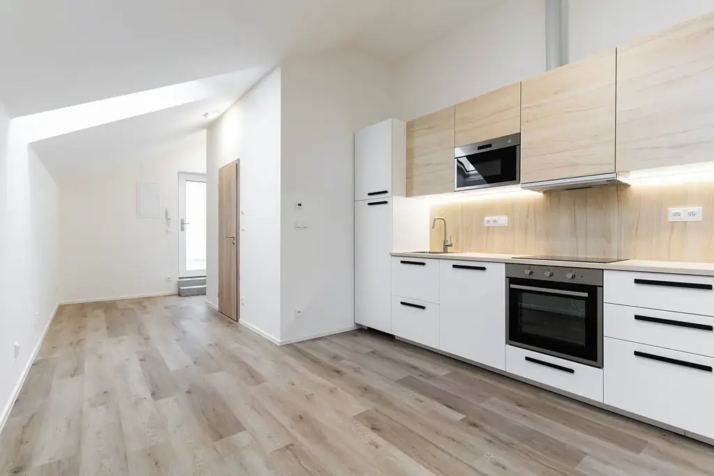 Byt prošel kompletní rekonstrukcí a nabízí moderní, čistý standard. Pronajímá se nevybavený, součástí je však nová kuchyňská linka včetně vestavěných spotřebičů, která poskytuje plnohodnotné zázemí pro každodenní fungování.