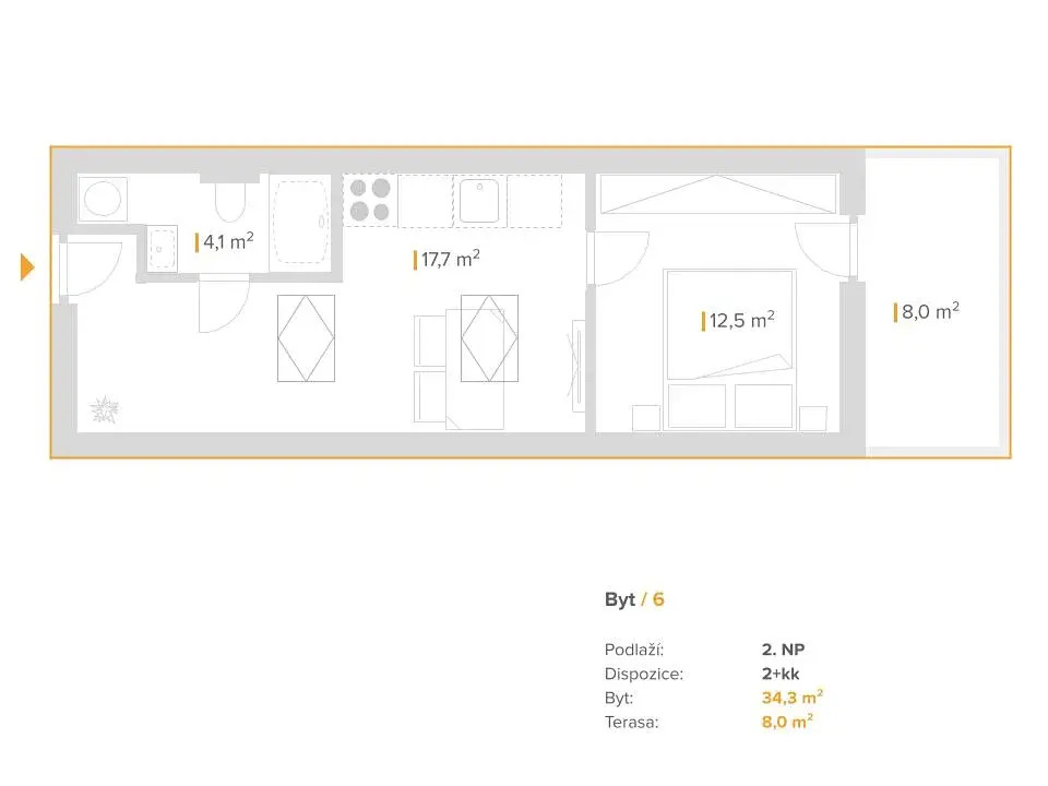 Dispozice je prakticky řešená – obytný prostor s kuchyňským koutem, samostatná ložnice a koupelna. Velkým benefitem je terasa o velikosti 8 m², která rozšiřuje obytný prostor a nabízí příjemné místo pro odpočinek.