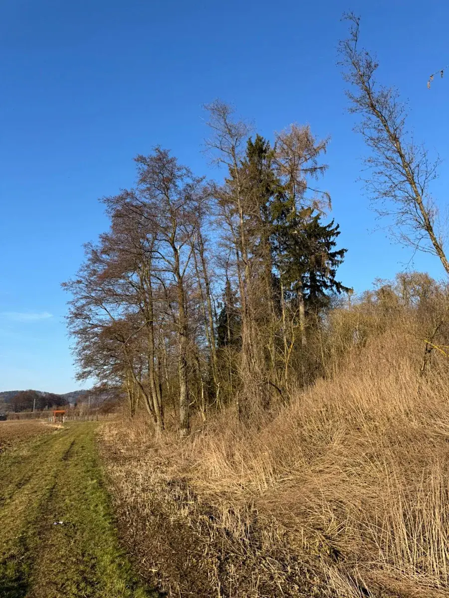 Pole je v mírném svahu, les ve svahu mezi poli.